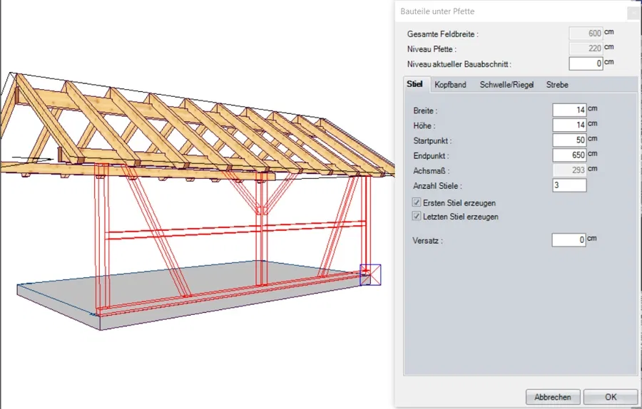 Freies Positionieren von Bauteilen für die Unterkonstruktion (Stiele, Kopfbänder, Streben etc.)